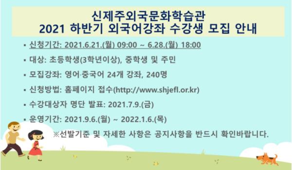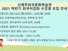 제주특별자치도교육청 제주국제교육원 신제주외국문화학습관은 6월 21일부터 28일까지 3학년 이상 초등학생과 중학생, 지역 주민을 대상으로 2021년 하반기 프로그램 수강생을 모집한다.