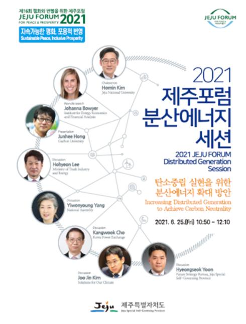제주특별자치도는 제16회 제주포럼 둘째 날인 오는 25일 오전 10시 50분 서귀포시 표선면 소재 제주해비치호텔 크리스탈홀A에서 ‘탄소중립 실현을 위한 분산에너지 확대 방안’ 주제의 세션을 운영한다고 밝혔다.