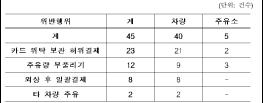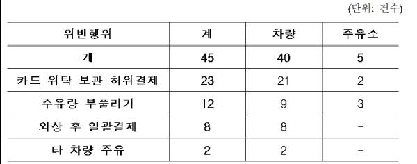 위반행위는 주유업자에게 카드를 위탁·보관하고 허위결제 23건, 실제 주유량을 부풀려 결제 12건, 외상 후 일괄결제 8건, 자동차등록번호 이외의 차량에 주유한 행위 2건 등 45건을 적발했다.
