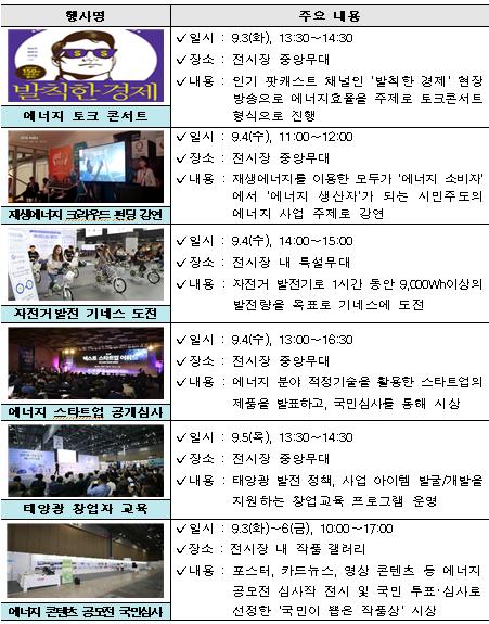 이와 더불어 에너지 토크 콘서트, 태양광 창업자 교육, 재생에너지 크라우드 펀딩 강연 등 다양한 분야의 교육도 준비되어 있다.