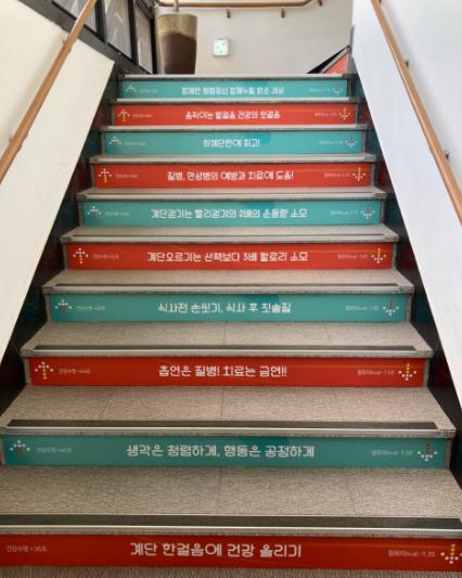 또한 계단ㆍ벽면 등을 활용해 칼로리 소모량, 계단걷기 효과 등 건강과 관련된 콘텐츠를 다양한 시각적 효과를 표현한 계단으로, 일상 속 걷기를 독려할 뿐 아니라 유익한 건강정보를 전달하고 있다.