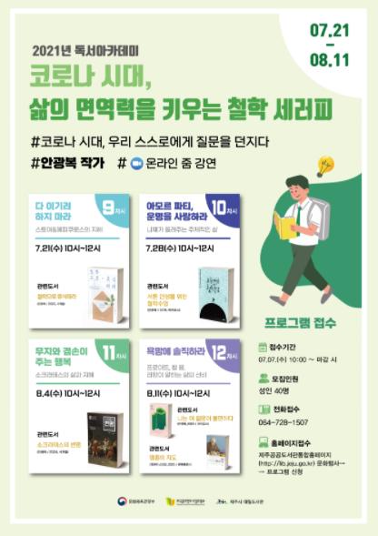 제주시 애월도서관은 7월 21일부터 8월 11일까지 4회에 걸쳐 매주 수요일 오전 10시에 온라인 비대면으로 『2021년 독서아카데미』‘코로나 시대, 삶의 면역력을 키우는 철학 세러피’를 주제로 강연을 한다.