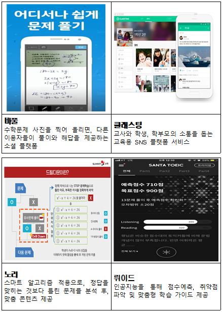 로봇코딩교구를 활용해 SW 교육을 하는 ‘럭스로보’, 인공지능 기반의 영어 말하기 학습 앱을 만든 ‘투미유’, 온라인 기반의 청음 교육과 연습 프로그램을 만든 ‘주스’ 등이 대표적인 기업이다.