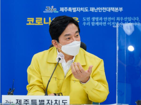 제주특별자치도는 제주에서 이틀연속 두 자리 수 신규 확진자가 발생한 가운데 8일 오전 9시 도 재난안전대책본부 상황실에서 원희룡 지사 주재로 코로나19 관련 긴급대책회의를 개최했다고 밝혔다.