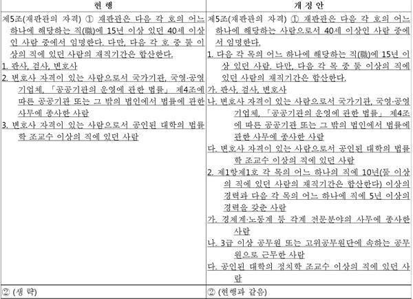 현행 헌법재판소법은 헌법재판소 재판관의 자격으로 40세 이상의 사람 중 15년 이상 판사, 검사, 변호사 등으로 재직한 법조경력을 요구하고 있다.