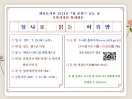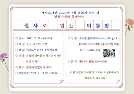 제주특별자치도교육청 제남도서관은 지역주민들에게 일상 속에서 문화를 즐길 수 있는 기회를 제공하고자‘2021년 7월 문화가 있는 날–필사로 읽는 여름밤’을 운영한다.