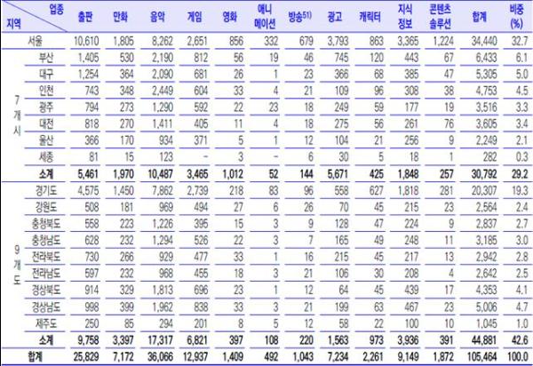 문체부와 콘진원이 제출한 '문화콘텐츠 산업 지역별 사업체 수 현황'자료를 보면, 서울의 경우 출판, 만화, 음악, 게임, 영화, 애니, 방송, 캐릭터, 지식정보, 콘텐츠솔루션 등 콘텐츠사업체 수가 34,440개로 전체의 32.7%를, 경기도는 2만307개로 19.3%를 차지했다.