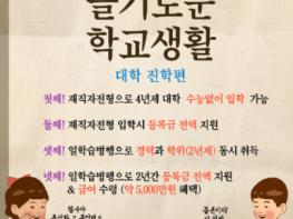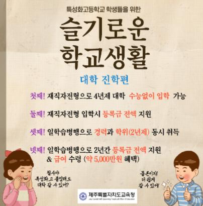 제주특별자치도교육청은 수능 없이 대학 입학이 가능하고 등록금 걱정 없이 학위를 취득할 수 있는 특성화고 대학 입학 지원 정책을 담은 '슬기로운 학교생활-선취업 후학습을 위한 대학진학편' 홍보 포스터를 제작, 배포하고 있다.