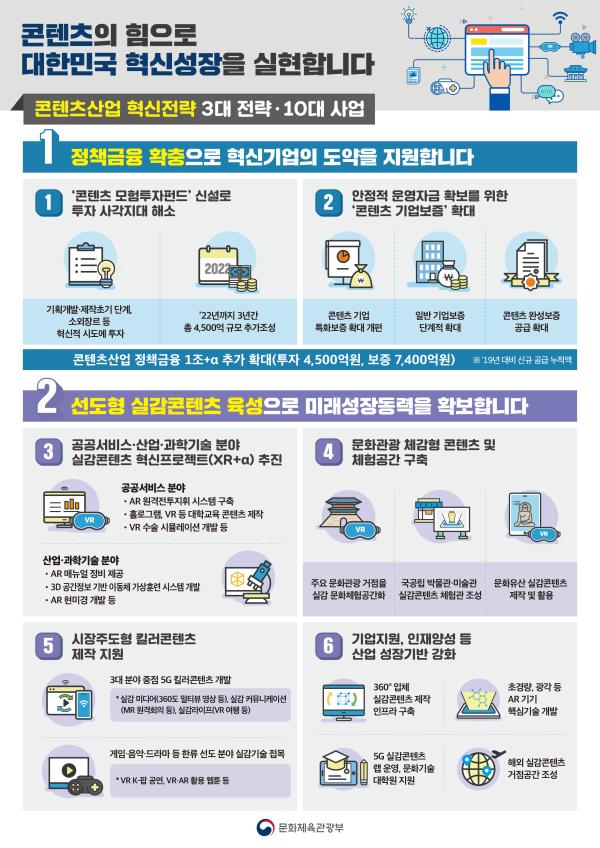 정부는 17일, 서울 홍릉 콘텐츠문화광장에서 ‘대한민국 콘텐츠, 빛이 되다’ 행사를 개최하고, 콘텐츠산업을 혁신성장 시대의 주력 산업으로 육성하기 위한 ‘콘텐츠산업 3대 혁신전략’을 발표했다.