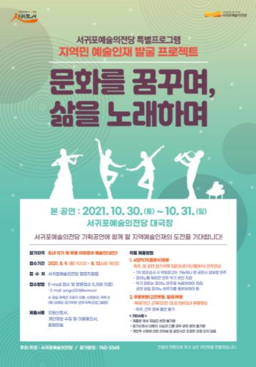 서귀포시는 지역민 예술 인재 발굴 프로젝트“문화를 꿈꾸며, 삶을 노래하며”기획공연 출연자 선정을 위한 1차 영상심사 신청을 다음달 9일부터 받는다.