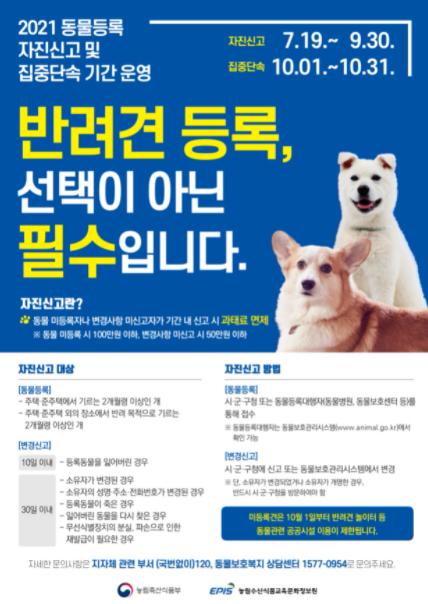 특히, 이번 자진신고 기간이 끝나면 10월 1일부터 10월 31일까지 반려견 미등록자 및 변경사항 미신고자를 대상으로 반려동물의 출입이 많은 동물의 영업장(미용업 등)과 공원 등에서 집중 단속을 실시할 예정이다.
