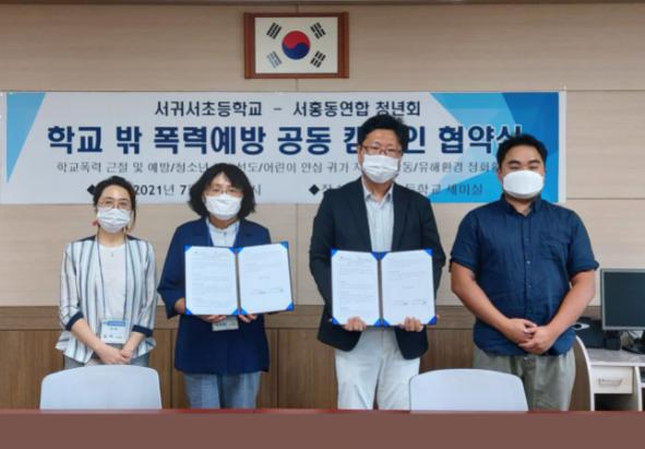 제주특별자치도교육청 서귀서초등학교는 2021년 7월 26일, 본교 세미실에서 서홍동연합청년회와 함께 학교 밖 폭력예방 및 청소년 선도를 위한 협업강화 협약식을 체결하였다.