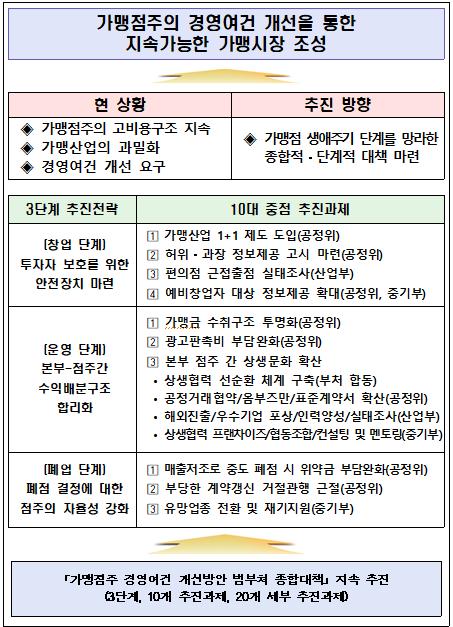 이번 대책은 법령 정비 및 제도 개선을 통해 창업, 운영 및 폐업 전 단계에서 가맹점주를 지원하여 지속가능한 가맹시장을 조성하는데 중점을 두었다.