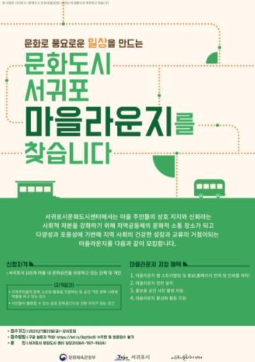 서귀포시문화도시센터는 마을 주민들의 상호지지와 신뢰라는 사회적 자본을 강화하기 위해 지역공동체의 문화적 소통 장소가 되고 다양성과 포용성에 기반해 지역사회의 건강한 성장과 교류의 거점이 되는 마을라운지를 오는 7월 23일부터 상시 모집한다.