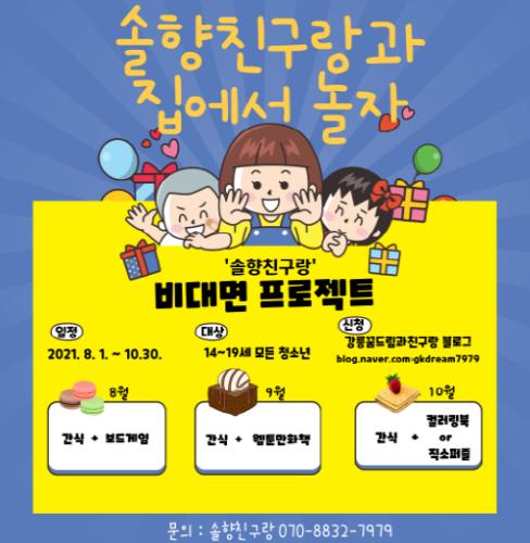 솔향친구랑은 코로나19 확진자의 급격한 증가로 일상생활이 제한된 강릉시 청소년들을 위해 8월에서 10월까지 간식 보드게임, 간식 만화책, 간식 컬러링북 또는 직소퍼즐을 지원하는 비대면 돌봄서비스를 제공한다.