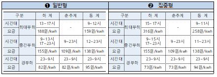 집중형은 최대부하 요금적용 시간대가 하계 2시간, 동계 2시간이며 경부하 요금 대비 최대부하 요금이 하계 4.3배, 동계 2.7배로 구성된다.