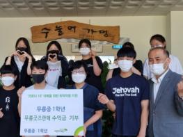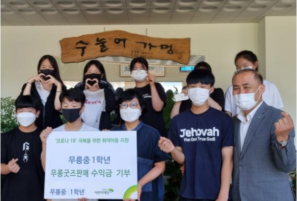 무릉중학교 1학년 학생들은 판매 수익금을 기부할 여러 단체를 검색해 보고 토의를 거쳐 국내외 어린이를 돕는 일을 해온 초록우산 어린이 재단을 선정하였다. 코로나19로 도움의 손길이 더욱 필요한 어린이들을 돕는데 의미 있게 쓰이기를 바라며 수익금 전액을 기부하였다.
