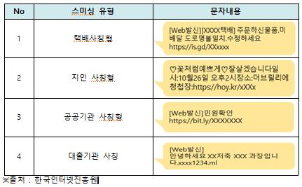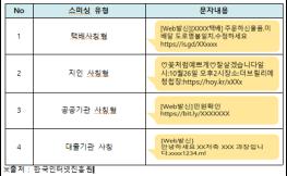 금융기관이나 포털의 정상앱을 사칭하는 악성앱은 육안상으로는 구별이 어려울 정도로 정상앱과 유사하게 만들 뿐 뿐 아니라 해커들이 악성앱 유포 시 이용자 관심을 유도하기 위해 ‘택배사칭’, ‘지인사칭’, ‘공공기관사칭’ 등 다양한 형태의 문자메시지를 이용하고 있는 것으로 확인됐다.