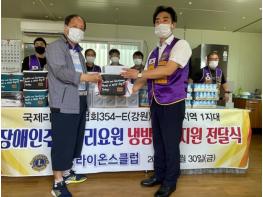 횡성군 섬강라이온스클럽(회장 송주철)은 지난 30일 오전 11시 주차관리사무소를 찾아 (사)횡성군장애인협회 소속 주차관리요원(12명)을 대상으로 쿨러백, 선풍기, 음료 등 100만원 상당의 후원 물품을 전달했다.