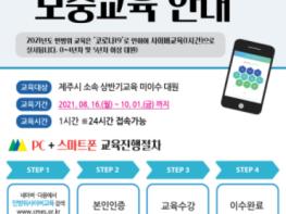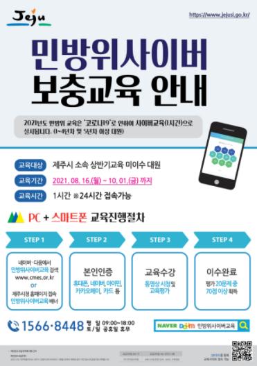 제주시는 오는 8월 16일부터 10월 1일까지 상반기 본 교육 미이수 대원을 대상으로 ‘2021년 민방위 사이버 보충교육’을 실시한다고 밝혔다.