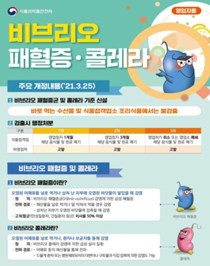 비브리오 식중독(패혈증·콜레라)은 5~6월경을 시작으로 해수온도가 상승하는 8~9월에 가장 많이 발생하고, 비브리오 식중독에 감염되면 12~72시간의 잠복기를 거쳐 발열, 오한, 혈압 저하, 복통, 구토, 설사 등이 발생하며, 발진, 부종과 같은 피부병변이 나타나기도 한다.