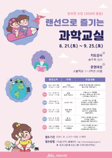 과학 교실 운영은 초등 1~3학년 20명 대상으로 8월 21일부터 9월 25일까지 매주 토요일 송주희 과학탐구 강사와 함께 줌(ZOOM플랫폼)을 활용한 온라인 수업으로 진행된다.