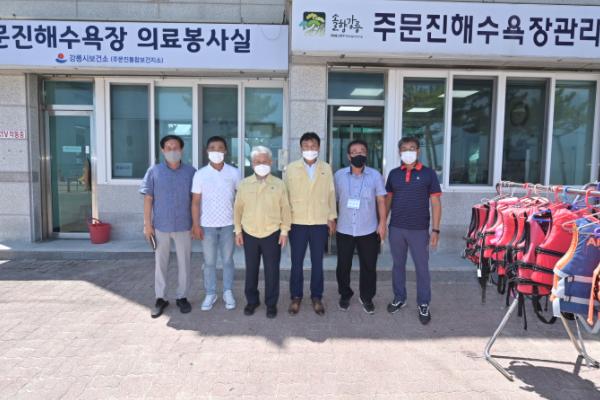 강릉시의회는 8월 4일 경포·주문진해수욕장 등 관내 7개 해수욕장을 찾아 행정봉사실 근무자 및 경찰서, 소방서 등 유관기관 관계자들을 격려하고, 코로나19 확산 최소화에 만전을 기해 줄 것을 당부했다.