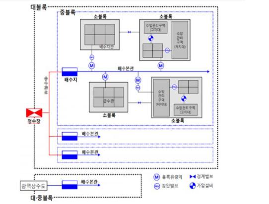 블록시스템은 지역 상수도 관망을 블록형태로 구성해 블록별로 실시간 수량 및 수압을 감시해 유수율을 관리하며, 비상 시에는 단수구역을 최소화하기 위한 시스템이다.
