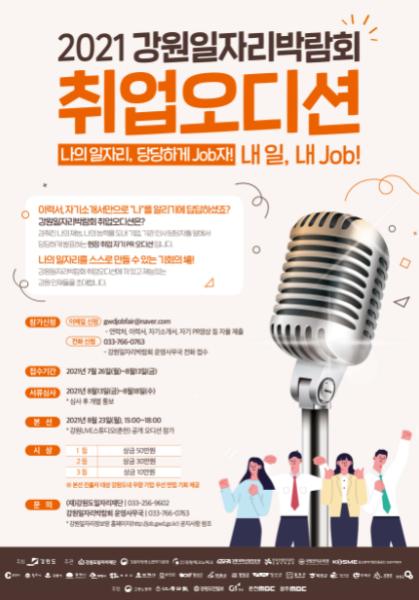 강원도일자리재단(대표이사:노명우)은 오는 8월 23일 춘천 글로벌 디지털 스튜디오 강원LIVE에서 ‘2021 강원일자리박람회’개막식과 함께‘취업오디션 내 일, 내 JOB !’행사를 진행한다.