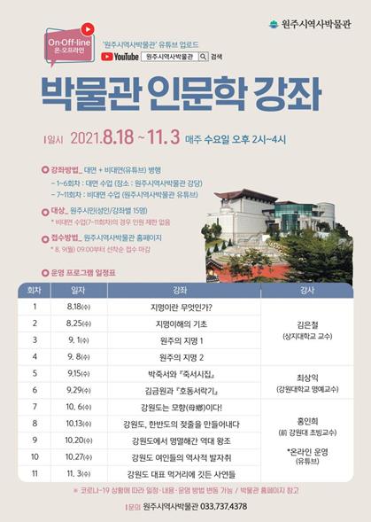 원주의 역사·인물·지명을 주제로 8월 18일부터 11월 3일까지 매주 수요일(14:00~16:00) 총 11회에 걸쳐 진행될 예정이다.