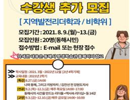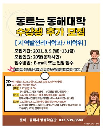 동해시는 2021년 '동트는 동해대학' 제1기 '지역발전리더학과/비학위' 수강생을 오는 13일까지 추가 모집한다.