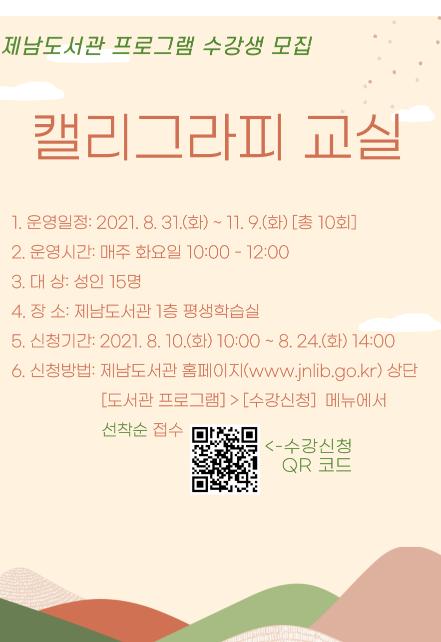 제남도서관(관장 황정식)은 지역주민을 대상으로‘캘리그라피 교실’수강생을 8월 10일부터 모집한다.