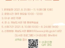 수강신청은 성인 15명을 대상으로 하며 제남도서관 홈페이지 상단메뉴 [도서관프로그램] - [수강신청]에서 8월 10일 오전 10시부터 8월 24일 오후 2시까지 신청 가능하다.