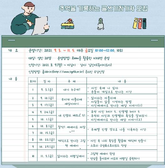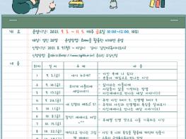 본 프로그램은 김진아(독서교육지도사)의 지도로 2021년 9월 3일부터 11월 5일까지 10회에 걸쳐 오전 10시부터 12시까지 성인 20명을 대상으로 운영되며, 비대면 온라인(Zoom) 방식으로 진행된다.