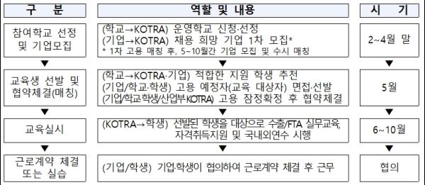 추진일정은 2월 공고를 시작으로 학교선발 및 기업모집, 학생-기업간 매칭, 자유무역협정실무교육, 채용의 과정을 거쳐 수행한다.