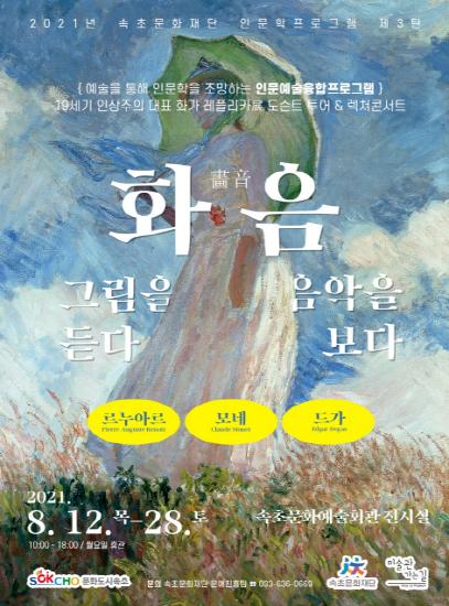 (재)속초문화재단(이사장:김철수)은 '2021인문학프로그램-3탄’으로 8월 12일부터 속초문화예술회관 전시실에서 예술과 인문학을 결합한 [화음(畵音): 그림을 듣다, 음악을 보다]를 진행한다.