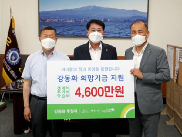 제주시에서는 10일, 제스코마트 강동화 대표의 고액기부로 조성된 「강동화 희망기금」 후원금 전달식을 시장 집무실에서 개최했다고 밝혔다.