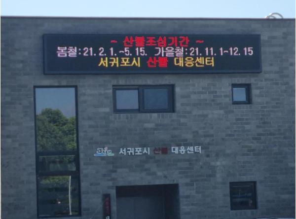 서귀포시는 2021년 가을철 산불 조심기간 전에 시민들에게 산불조심에 대한 경각심을 심어주기 위해 서귀포시청 2청사에 위치한 산불대응센터에 산불예방 홍보 LED 전광판을 설치하였다.