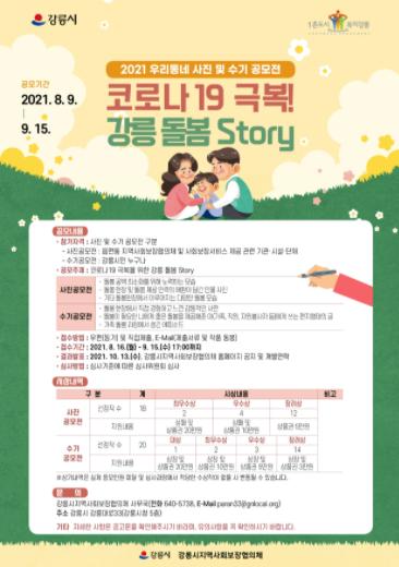 강릉시지역사회보장협의체(공동위원장 왕종배, 김한근)는 지역사회복지에 대한 관심과 참여도를 높이기 위하여 「2021 우리동네 사진 및 수기 공모전」을 8월 9일부터 9월 15일까지 진행한다고 밝혔다.