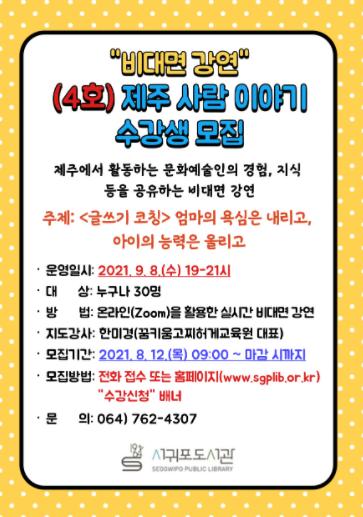 제주특별자치도교육청 서귀포도서관, 비대면 강연(4호) 제주 사람 이야기 수강생 모집