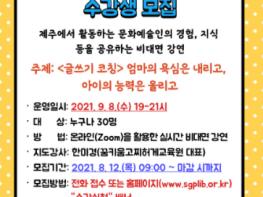 비대면 온라인(Zoom) 방식으로 진행되는 이번 강연에서는 한미경(꿈키움고찌허게교육원 대표, 오늘도 안녕하신지요? 저자) 선생님을 모시고‘ 글쓰기 코칭 엄마의 욕심은 내리고, 아이의 능력은 올리고’라는 주제로 오는 9월 8일 오후 7시~9시 운영된다.