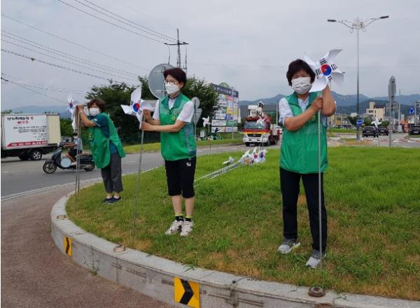 횡성군 횡성읍부녀회와 횡성읍행정복지센터는 지난 11일 오전 10시, 횡성전통시장을 방문해 시장 상인들에게 태극기를 전달하였다.