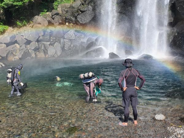 이번 정화활동은 관내 다이버 자원봉사자와 직원 10여명이 함께 정방폭포 상류 하천에서 떠내려 온 각종 잡목과 생활쓰레기와 바다로부터 폭포 주변 해안가로 유입된 해양쓰레기를 수거하기 위해 폭포 밑 수중작업을 집중적으로 실시하였다.
