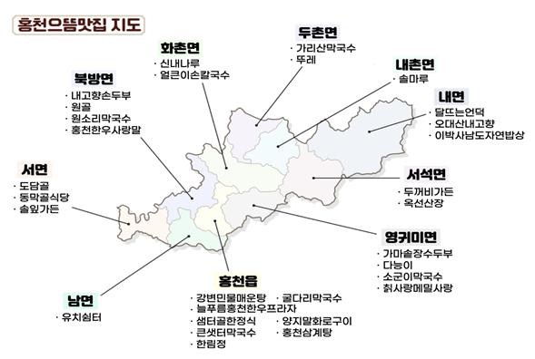 홍천으뜸맛집은 홍천읍(강변민물매운탕·굴다리막국수·늘푸름홍천한우프라자·샘터골한정식·양지말화로구이·큰샛터막국수·한림정·홍천삼계탕)이 8곳으로 가장 많다.