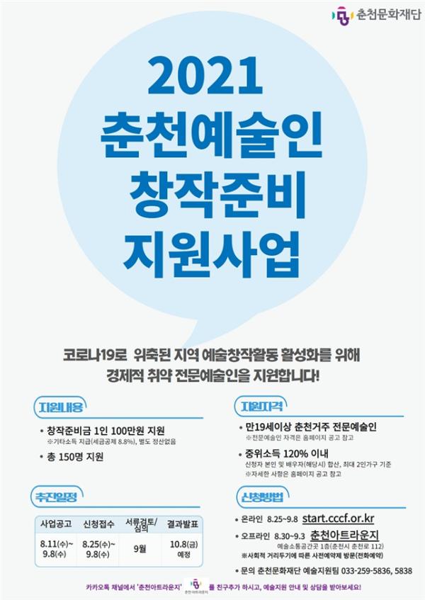 춘천문화재단은 코로나19로 위축된 지역 예술창작활동 활성화를 위해 ‘춘천예술인 창작준비 지원사업’ 을 오는 8월 11일부터 9월 8일까지 진행한다.