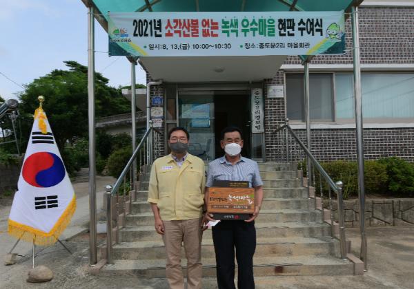 속초시 도문동 중도문 2리 마을이 산림청에서 추진한 2021년 소각산불 없는 우수 녹색마을에 선정되어 13일 오전 마을회관에서 현판 전수 및 시상금 전달식을 가졌다.