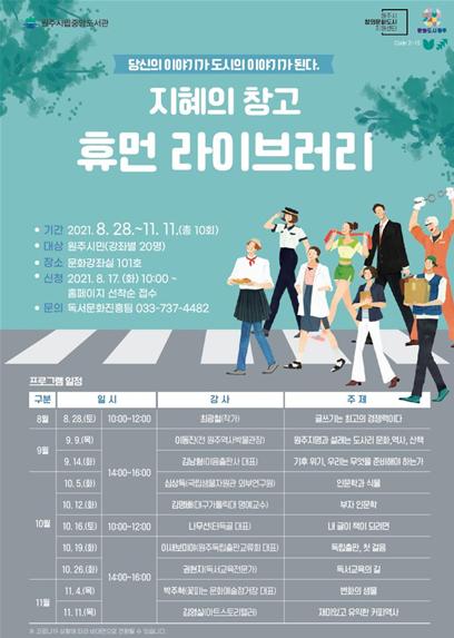 원주시립중앙도서관(관장 이문희)이 원주시 창의문화도시지원센터와 연계한 '중앙도서관테이블' 사업의 하나로 ‘지혜의 창고-휴먼 라이브러리’를 운영한다.