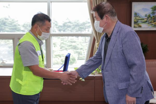 원주시시설관리공단 직원인 두 사람은 7월 29일 오전 10시 55분경 도로 청소를 위해 이동 중 호저면 원문로 인근 컨테이너 창고에서 연기가 나는 것을 발견하고 노면 청소차 용수를 활용해 불을 끄는 등 신속한 초동 대처로 대형화재를 막았다.