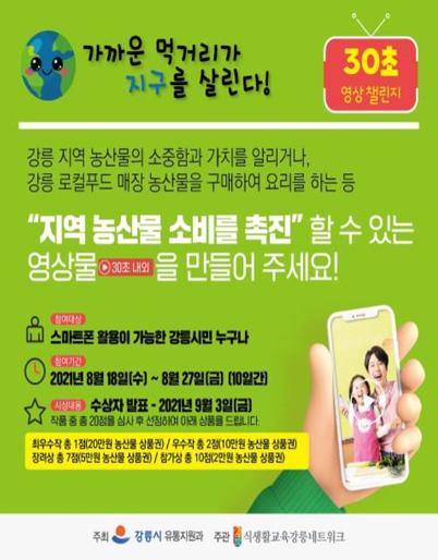 강릉시와 식생활교육강릉네트워크(허경자 대표)는 코로나19 상황에서도 2021년 식생활문화개선 교육사업을 지속적으로 펼쳐나가기 위해 강릉시민을 대상으로 30초 영상챌린지“로컬푸드 지역먹거리가 지구를 살린다”프로그램을 운영한다.
