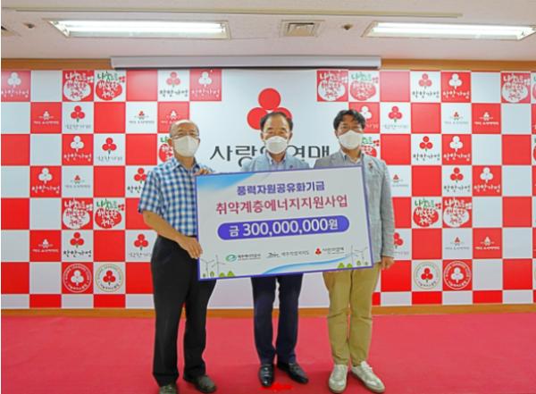 제주특별자치도와 제주에너지공사는 풍력자원 공유화기금을 활용해 3억 원을 제주사회복지공동모금회에 전달했다고 밝혔다.